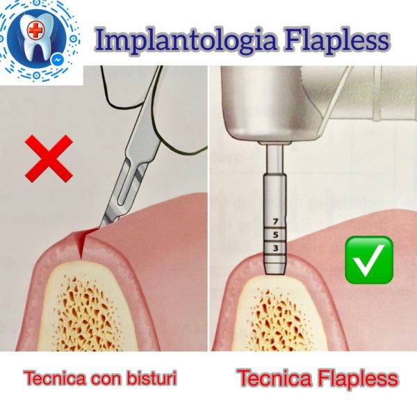 Implantologia indolore, senza tagli alla gengiva senza suture e nessun gonfiore. È una tecnica che si chiama Flapples. Consiste in una piccola apertura circolare di pochi millimetri che viene praticata sotto anestesia con un attrezzo rotante. Quando è possibile evitiamo in questo modo l’apertura di un lembo con taglio mucoso e con relativa sutura gengivale.
